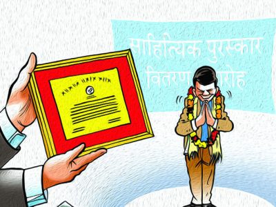 साहित्यकार बडो भोलाभाला प्राणी हुन्छन् । सरकार र भुस्याहा कुकुरलाई जसरी जसले पनि गाली गर्ने अधिकार पाएको हुन्छ त्यसैगरी साहित्यकारलाई जसले पनि सम्मान गर्ने अख्तिायारी स्वतः पाएका हुन्छन् । मेरा एक जना मित्र छन् वार्षिक एक आध खादा ओढेनन् भने उनको प्रेसर बढ्छ । गोडा बिसेक हजारको पुरस्कार हात परेन भने उनी थला पर्छन् । धन्य, नेपालमा दिनहुँ यति प्रतिष्ठान खुलिरहेका छन् कि उनको ज्यानमा तल माथि परेको छैन । पुरस्कृत नभए पनि बेला कुबेला सम्मान कार्यक्रममा अतिथिको आसनमा बस्न पाएका छन् । मुलुकले एउटा साहित्यकार सहीसलामत पाएको छ ।