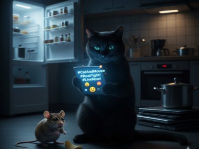 म्याउँ: (अचानक मोबाइल उठाउँदै, अनुहारमा कृत्रिम उज्यालो चम्काउँदै) “अँ… अहिले होइन मुसु। TikTok Live मा ‘Cat and Mouse – Real Fight!’ भनेर ह्यासट्याग राख्दैछु, भ्यूज (Views) बढेपछि र विज्ञापन (Ad Revenue) आएपछि मात्रै तँलाई खान्छु। तयार हो ! एक्शन !”
