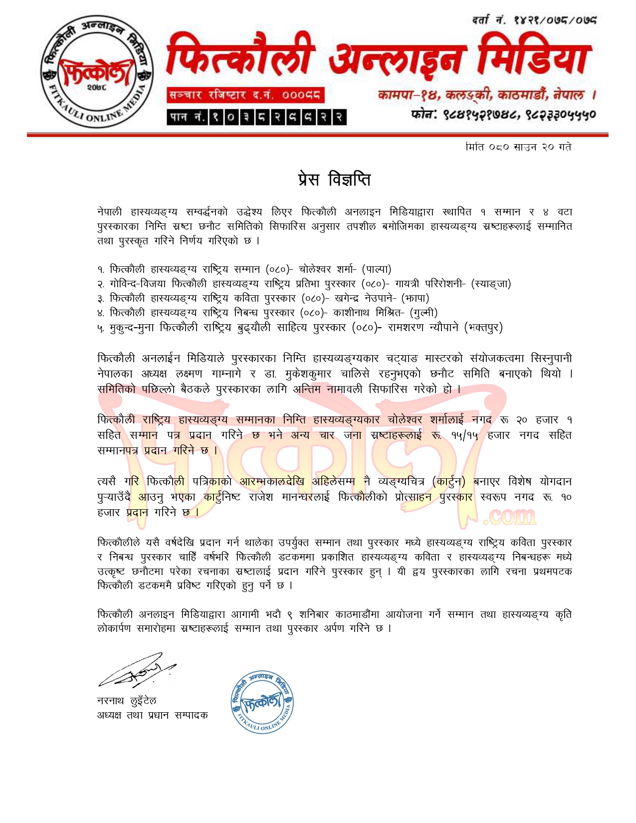 फित्कौली अनलाइन मिडियाद्वारा आगामी भदौ ९ गते शनिबार काठमाडौंमा आयोजना गर्ने ‘फित्कौलीको खित्कौली सभा–२’ अन्तर्गत सम्मान तथा हास्यव्यङ्ग्य कृति लोकार्पण समारोहमा स्रष्टाहरूलाई सम्मान तथा पुरस्कार अर्पण गर्ने भएको छ ।