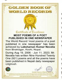 उद्घोष दैनिकमा सन् २००६ अगस्त १९ देखि २०२३ जून ११ सम्ममा ९ सय २१ वटा कविता प्रकाशित भएकोमा उनलाई गोल्डेन बुक अफ वर्ल्ड रेकर्डस्द्वारा सम्मान प्रदान गरिएको हो ।