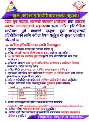 मकवानपुर, ०८० आश्विन २४ । प्रदेश युवा परिषद, बागमती प्रदेशको आयोजना एवम् साहित्य सङ्गम मकवानपुरको सहकार्यमा आयोजित राष्ट्रिय खुला कविता प्रतियोगिताका लागि उत्कृष्ट २० कविताको नामावली सार्वजनिक गरिएको छ ।