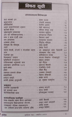 आनन्द भारतीको ‘आगामी प्रधानमन्त्री’, शरद जोशीको ‘दुई जुत्ताको कथा’ र हरिशङ्कर परसाईंको ‘क्रान्तिकारीको कथा’ शीर्षकको अनुवाद प्रकाशित छन् । समालोचना/समीक्षा अन्तर्गत गोपी मैनालीको ‘शब्द-शब्दसँग खेल्ने भैरव अर्यालका...’, ठाकुर शर्मा भण्डारीको ‘हास्यव्यङ्ग्य निबन्धहरूको सँगालो’, प्रमोद प्रधानको ‘रामकुमार पाँडेका हास्यव्यङ्ग्य...’