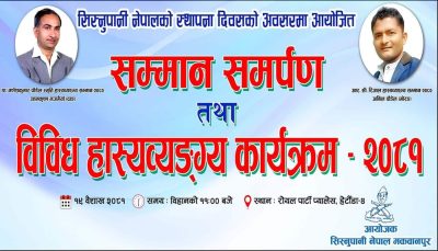 एनएस टेलिभिजनले छायाङ्कन गरी रोयल प्यालेस हेटौँडामा आयोजित कार्यक्रमलाई सिस्नुपानी मकवानपुरका सचिव गोविन्द पौडेल र सहसचिव संप्रस पौडेलले सहजीकरण गर्नु भएको हो ।