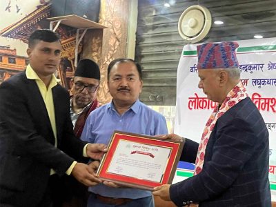 कार्यक्रममा प्रमुख अतिथि पन्तले सुभाना मिडिया प्रालिको तर्फबाट साहित्यकार इन्द्रकुमार श्रेष्ठ सरित्लाई “सुभाना आख्यान सम्मान – २०८१” बाट सम्मान गर्नुभएको थियो