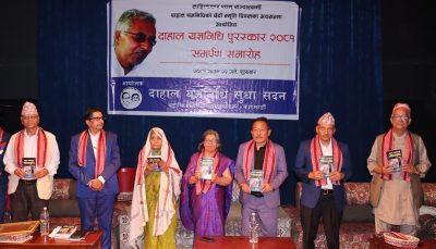काठमाडौं, २०८१ साउन २५ गते । साहित्यकार तथा सञ्चारकर्मी दाहाल यज्ञनिधि पुरस्कार-२०८१ इतिहासकार एवम् साहित्यकार स्वर्गीय ज्ञानमणि नेपाललाई प्रदान गरिएको छ । शुक्रबार दाहाल यज्ञनिधिको छैटौं स्मृति दिवसको अवसरमा राजधानीमा आयोजित विशेष कार्यक्रममा नेपाल प्रज्ञा प्रतिष्ठानका कुलपति भूपाल राईले कृतिशेष स्वर्गीय नेपाललाई प्रदान गर्नुभएको हो ।
