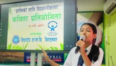 अगस्ट २९ अर्थात् ‘Embrace a world free of nuclear weapons day’ का अवसरमा ‘शान्तिका लागि निशस्त्रीकरण’ शीर्षकमा आयोजित कविता प्रतियोगितामा कक्षा ११ र १२ का विद्यार्थीहरू सहभागी थिए ।