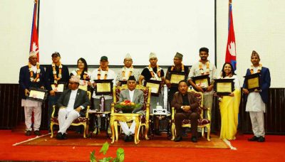 प्रमुख अतिथि तथा सम्माननीय राष्ट्रपति रामचन्द्र पौडेलले राष्ट्रपति भवन शीतल निवास महाराजगञ्जमा आयोजित एक समारोहबिच पुरस्कृत गर्नु भएकाे हाे ।