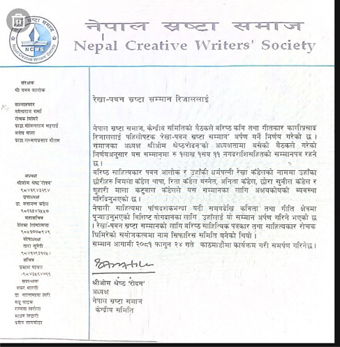 काठमाडौं, २०८१ फागुन ७ । नेपाल स्रष्टा समाजले रेखा -पवन स्रष्टा सम्मानद्धारा वरिष्ठ कवि तथा गीतकार कालीप्रसाद रिजाललाई अर्पण गर्ने गर्ने भएको छ ।