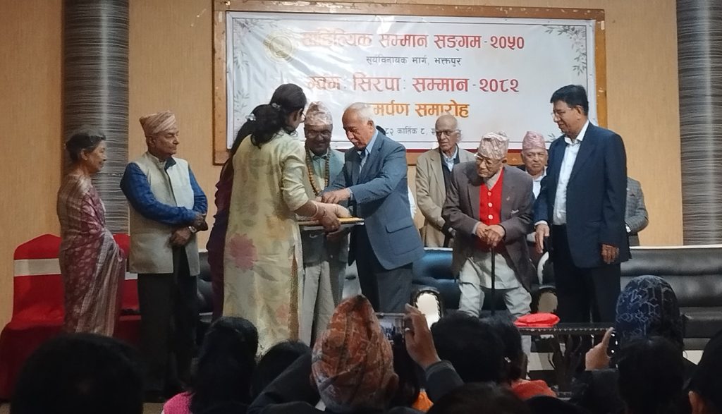 भक्तपुर, २०८२ कात्तिक १०। भक्तपुरको सूर्यविनायकस्थित भक्तपुर पार्टी भेन्युमा आयोजित एक समारोहमा दुई स्रष्टालाई नगद पुरस्कारसहित सम्मान गरिएको छ।
