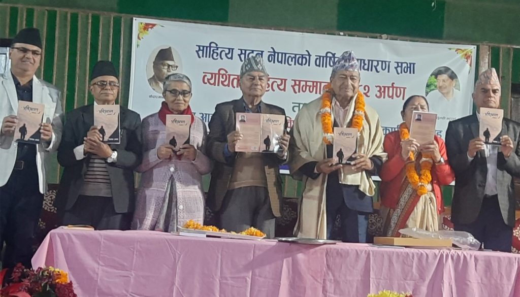 काठमाडाैं, २०८२ कार्तिक २८ । साहित्य सदन रामहिटीमा डा. तुलसीप्रसाद भट्टराईलाई यस वर्षको व्यथित साहित्य सम्मान अर्पण गरिएको छ । यसै कार्यक्रम मा स्रष्टा त्रिलोचन आचार्यद्वारा लिखित “अविश्रान्त” महाकाव्यको लोकार्पण पनि भएको छ ।