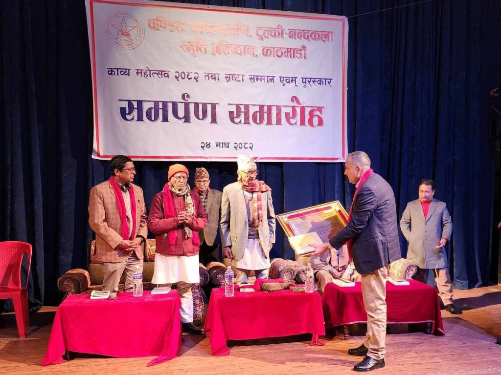 काठमाडौँ, २०८२ माघ २५ । पण्डित आनन्दमणि टुल्की नन्दकला स्मृति प्रतिष्ठानको आयोजनामा काव्य महोत्सव २०८२ तथा विद्यार्थी एवं स्रष्टा सम्मान तथा पुरस्कार समारोह काठमाडौँको जमलस्थित सांस्कृतिक संस्थान (राष्ट्रिय नाचघर)को सभाहलमा भव्य रूपमा सम्पन्न भएको छ।